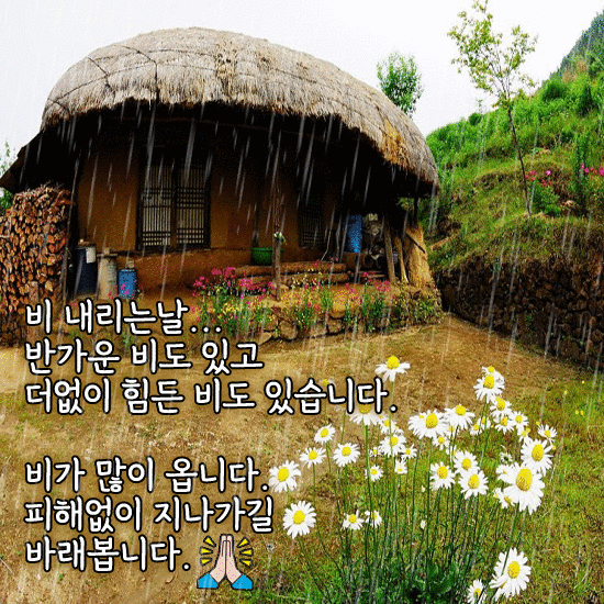 ☔ 폭우가 쏟아진다고 0 . 29 . ☔ 폭우가 쏟아진다고 폭우가 쏟아진다고하늘이 무너지는 것도 아니고 폭풍이 몰아친다고길이 떠내려 가는 것도 아니다. 폭우를 쏟아내야쪽빛 하늘이 열리고 폭풍이 휘몰아쳐야길은 검푸르게 열린다. 어둠이 밀려온다고 두려워 마라.어둠 속에서 꿈은 간절해 지는 것이다. – 이근대 또다른 좋은글 0 33 💌 마음의 우체통 0 30 ☂️ 장마 아침 0 25 🏝️ 쉬어가는 삶 0 23 💐 각인각심